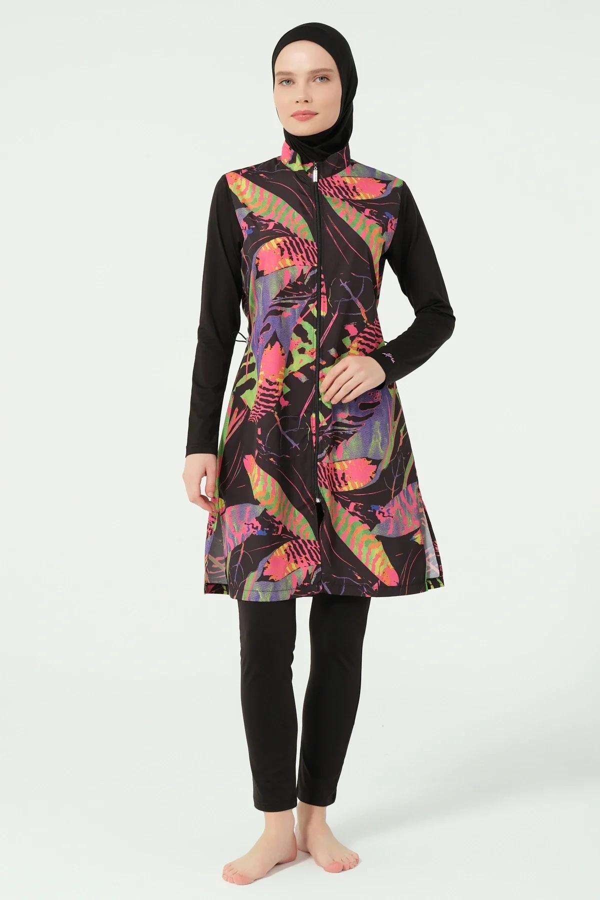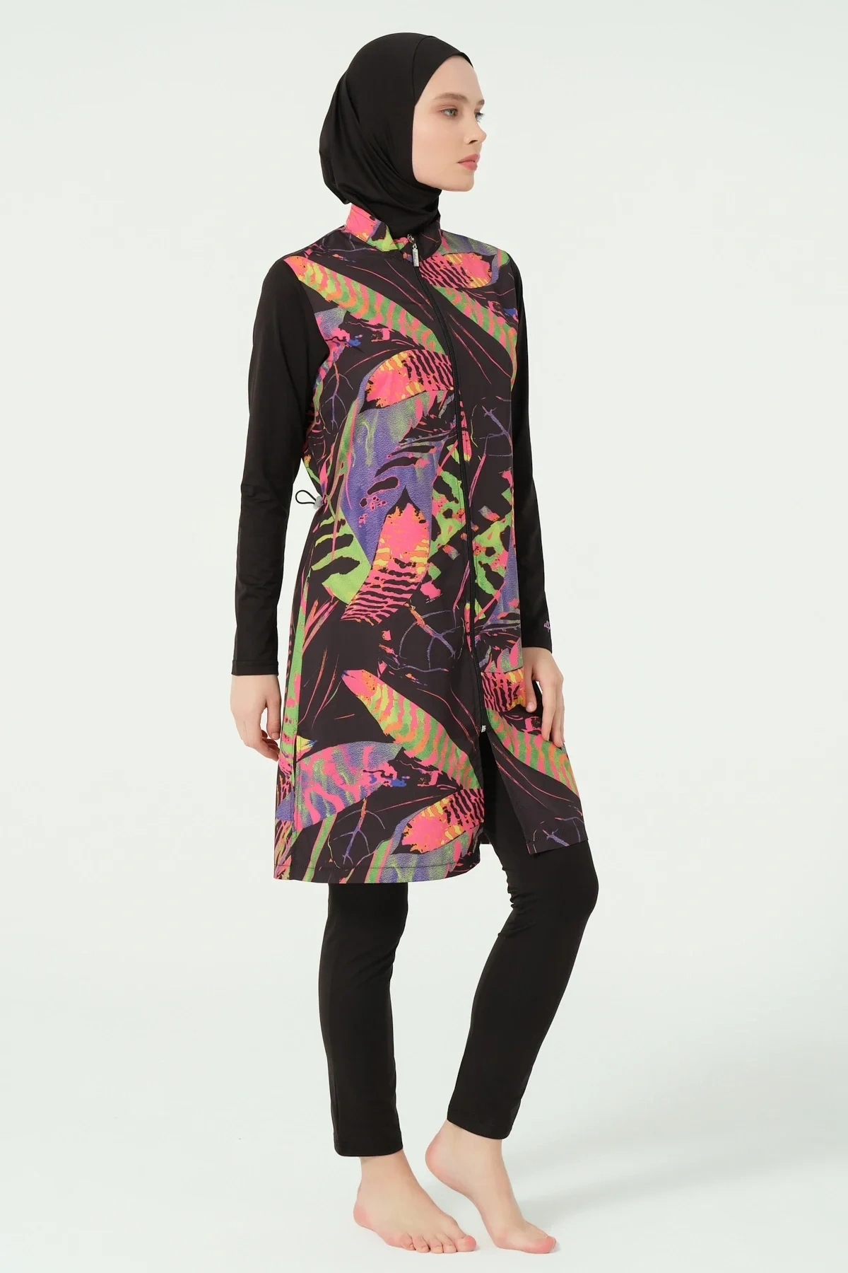 TR: Üst, Tayt, Eşarp, Bone, Tek parça iç çamaşırı olmak üzere 5 parçadan oluşmaktadır. Hızlı kuruma, kolay yüzme olanağı sağlar.