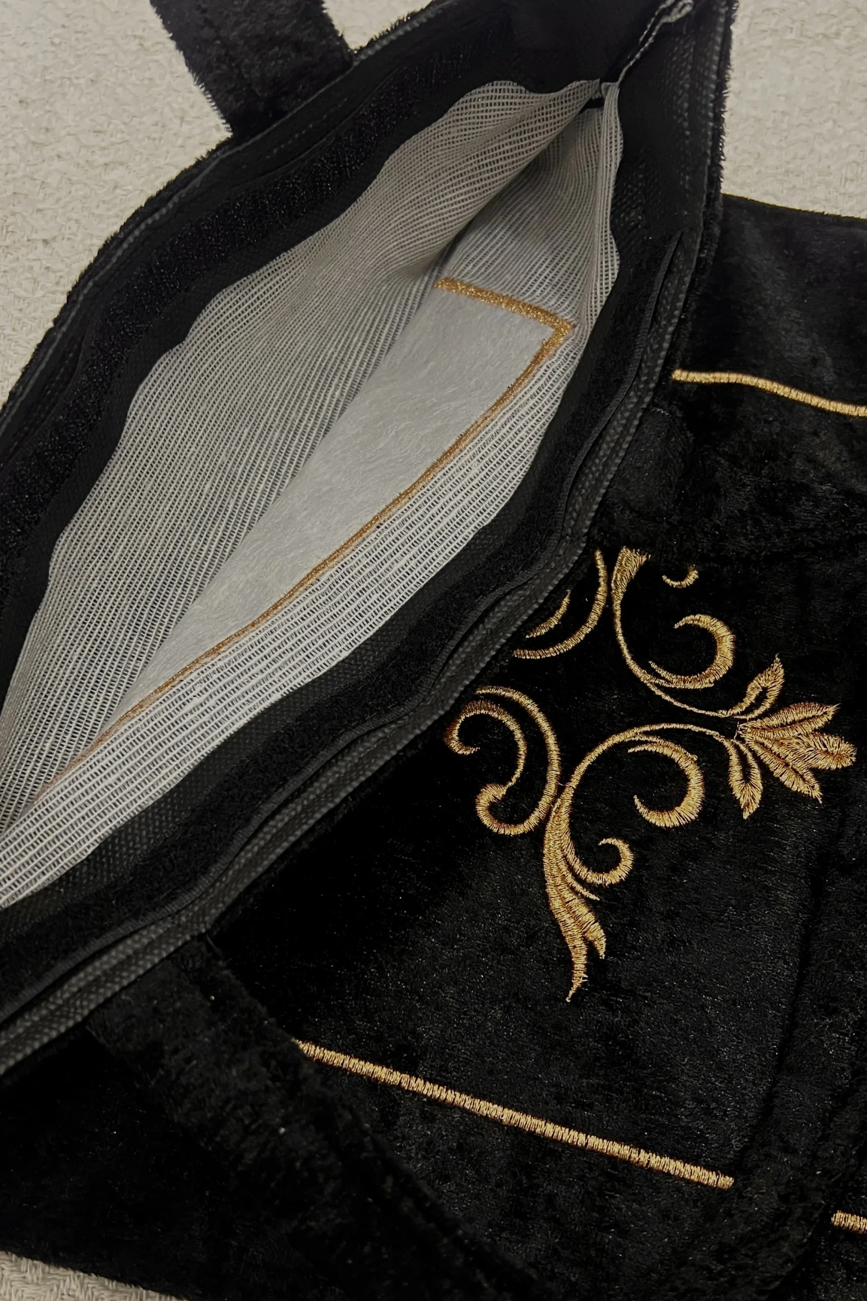 Zarif nakış detayları ile estetik bir görünüm sunan kadife çanta; seccade, Kur’an-ı Kerim, terlik ve çeyizlik ürünlerin düzenli şekilde taşınması ve muhafazası için özel olarak tasarlanmıştır. Şıklığı ve kullanışlı yapısıyla çeyiz setlerinin vazgeçilmez tamamlayıcısıdır.