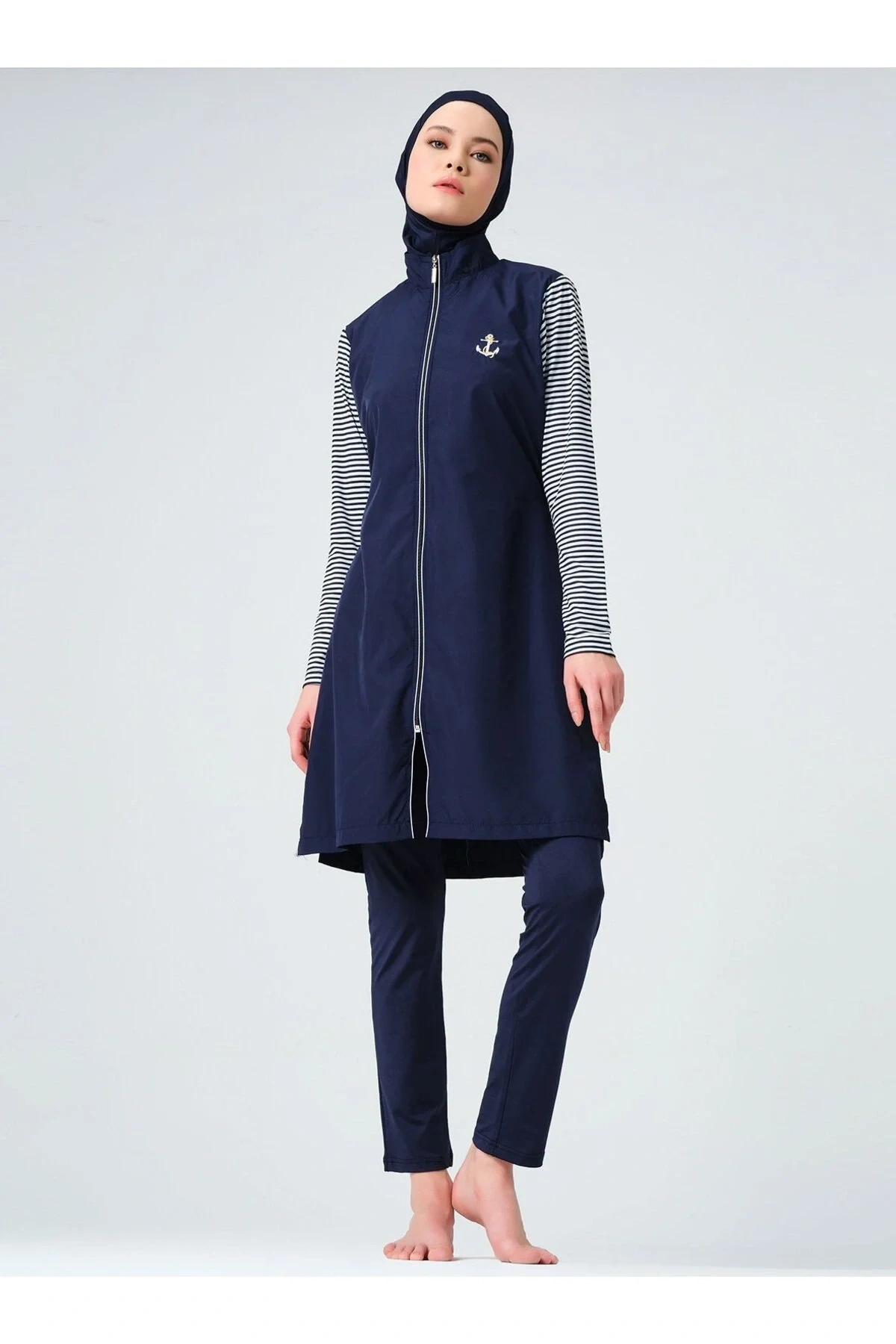 %100 Poliester, Su itici paraşüt kumaş - %95 Poliester, %5 Elastan, Su itici apre uygulanmıştır.; Üst, Tayt, Eşarp, Bone, Tek parça iç çamaşırı olmak üzere 5 parçadan oluşmaktadır.; Hızlı kuruma, kolay yüzme olanağı sağlar.; Su itici apreli.; Üst paraşüt kumaş.; Kıl biye detaylı.; Çapa nakış süslemeli.; Önü fermuar kapamalı.; Dik yaka.; Likra uzun kol.; Likra tayt.; Likra eşarp ve bone.; Tek parça iç çamaşır.; Kumaş Bilgisi: %100 Polyester Astar Tipi : Astarlı Resimdeki ürünün ölçüleri: Beden: M, Göğüs: 104 CM, Bel: 94 CM, Basen: 110 CM, Ön Boy : 100 CM