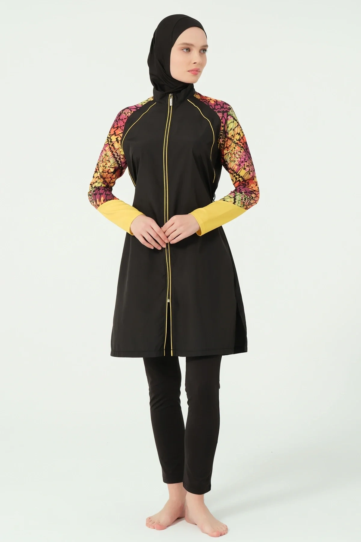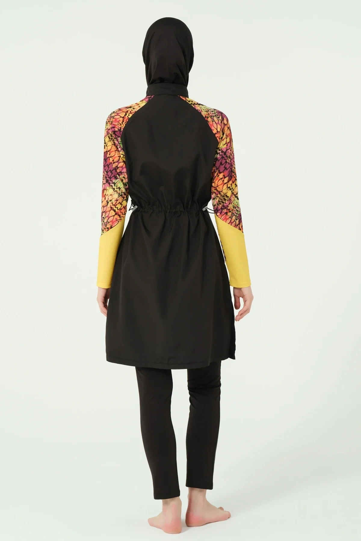 TR: Üst, Tayt, Eşarp, Bone, Tek parça iç çamaşırı olmak üzere 5 parçadan oluşmaktadır. Hızlı kuruma, kolay yüzme olanağı sağlar.
