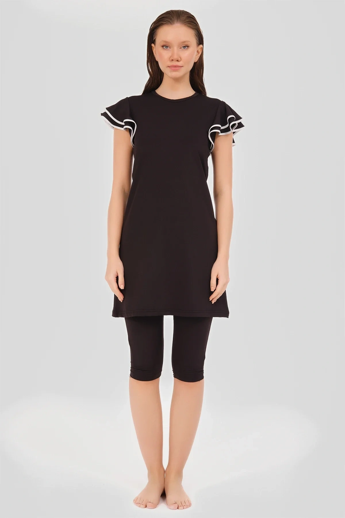 Kolu Volan Detaylı Yarım Kol Yarı Kapalı Mayo Zarif ve konforlu bu yarı kapalı mayo, suyun içinde mükemmel uyum ve hareket özgürlüğü sunan esnek likralı kumaş ile tasarlanmıştır. ; Canlı renkler ile her yaş ve bedene uygun bir görünüm sağlar. ; Tanım Su itici . ; Suyu iten apreli likra kumaş. ; Üst desenli. ; Volan detaylı kısa kol. ; Bisiklet yaka. ; Bone. ; Kısa tayt. ; Tek parça iç çamaşır Paket İçeriği Üst, Tayt, Bone, Tek parça iç çamaşırı olmak üzere 4 parçadan oluşmaktadır. ; Hızlı kuruma, kolay yüzme olanağı sağlar. ; Kumaş İçeriği %95 Poliester, %5 Elastan, Su itici apre uygulanmıştır.;