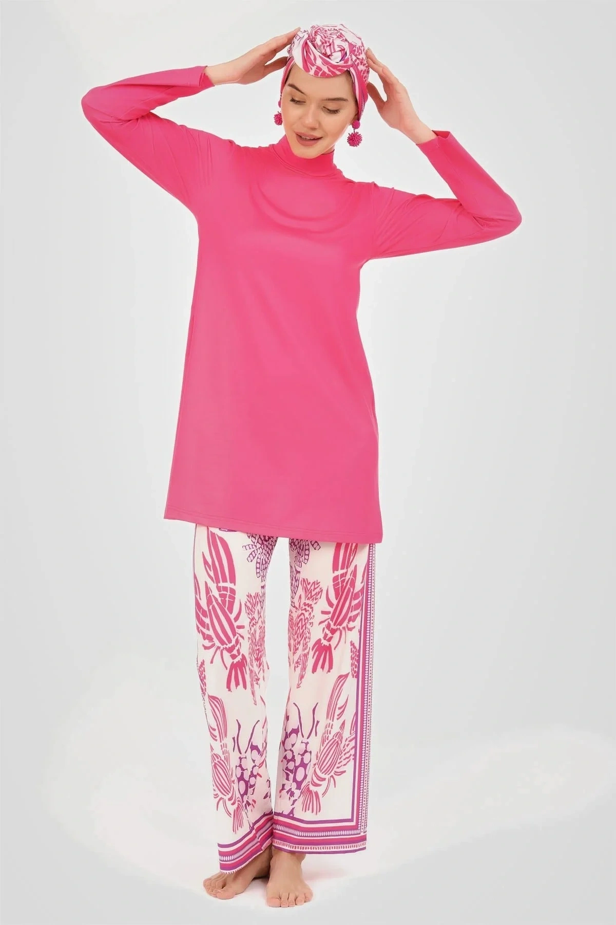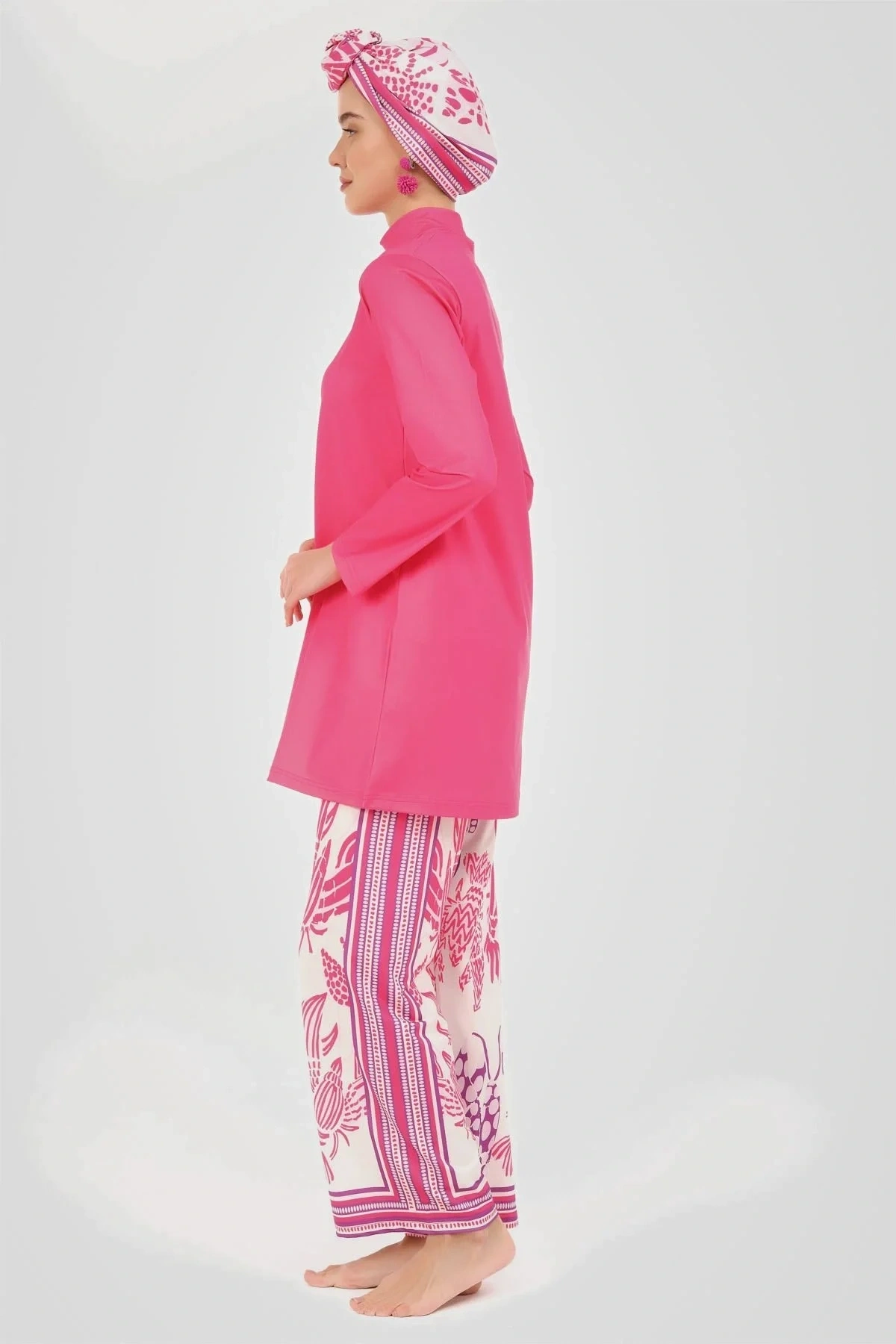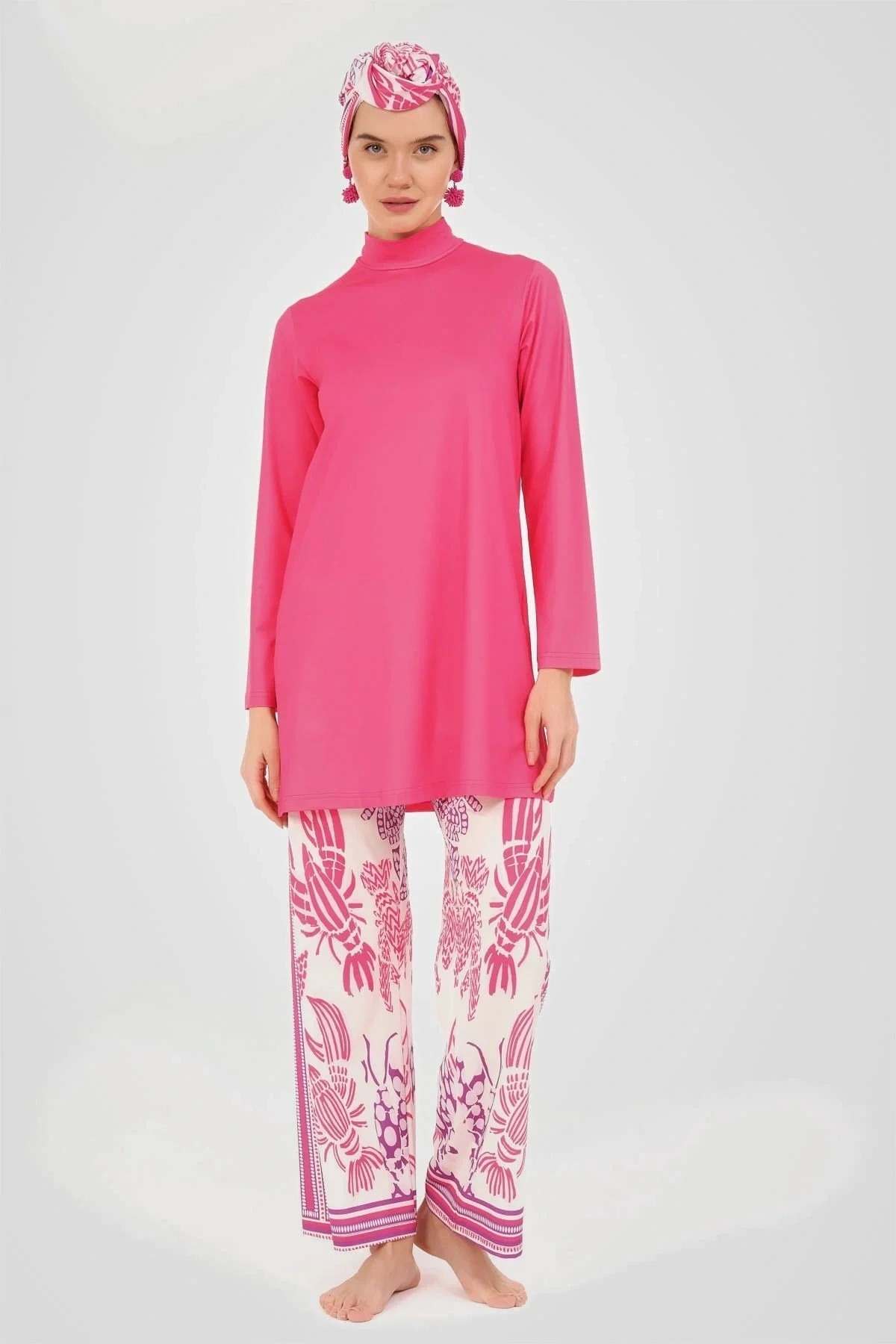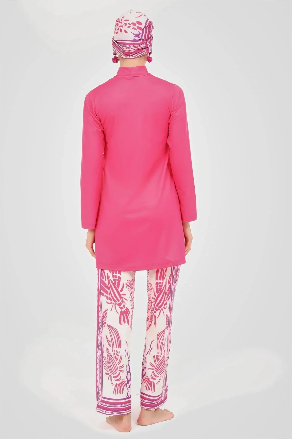 Yakamoz Desenli Tesettür Mayo Bu tesettür mayo, canlı ve göz alıcı renkleriyle dikkat çekerken, üzerindeki zarif desenlerle sofistike bir görünüm sunar. ; Likralı kumaşı, suyun içinde ve dışında rahat bir kullanım sağlayarak, gün boyu konfor ve şıklığı bir arada tutar. ; Tanım Su itici . ; Suyu iten apreli likra kumaş. ; Üst klasik bol kalıp. ; Uzun kollu. ; Dik yaka. ; Bol paça desenli pantolon. ; Tek parça iç çamaşır. ; Desenli üçgen eşarp ve bone. ; Paket İçeriği Üst, Pantolon, Üçgen bone, Bone, Tek parça iç çamaşırı olmak üzere 5 parçadan oluşmaktadır. ; Hızlı kuruma, kolay yüzme olanağı sağlar. ; Kumaş İçeriği %95 Poliester, %5 Elastan, Su itici apre uygulanmıştır.;